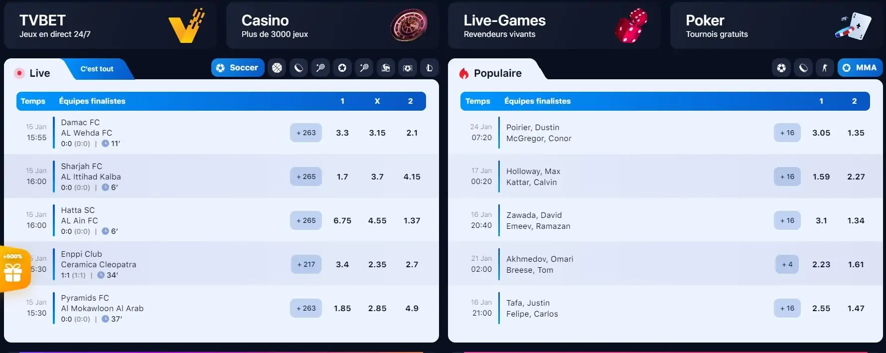 L’app mobile permet aux joueurs de placer des paris en pré-match et en direct. Le pari peut être conclu dans les options standard: paris simples, combinés. Pour les événements populaires, le bookmaker propose des diffusions de matchs. La section Live (en direct) fournit des centres d’information avec des statistiques sur les matchs en cours.