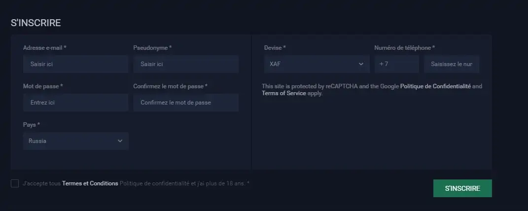 Une fois que l’on est à la page principale, on voit dans le coin supérieur droit le bouton correspondant appelé «S’inscrire». On clique dessus et commence le processus d’enregistrement simple en saisissant les données: