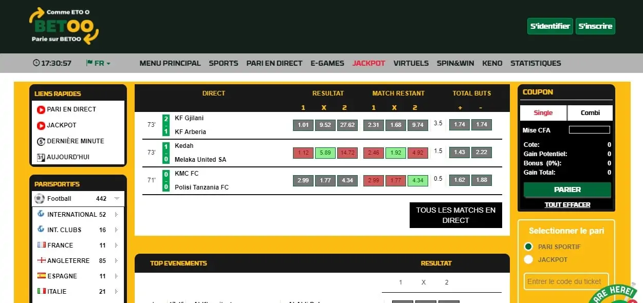 Betoo.cm propose des paris sportifs — football, tenis, basket-ball. Il y a des paris sur les événements qui se déroulent en cours ainsi que des eGames, jackpot, sports virtuels, Keno.