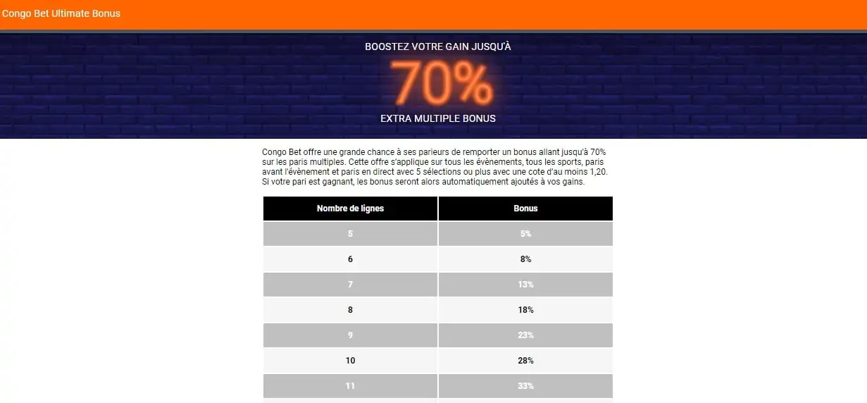 Congo Bet présente également une grande opportunité à ses clients d’utiliser un bonus jusqu’à 70% sur les paris combinés. Ce bonus s’applique sur tous les évènements et sports pour le pari à 5 sélections ou plus avec une cote d’au moins 1,20. Si votre mise est gagnante, les bonus seront alors automatiquement ajoutés aux gains.