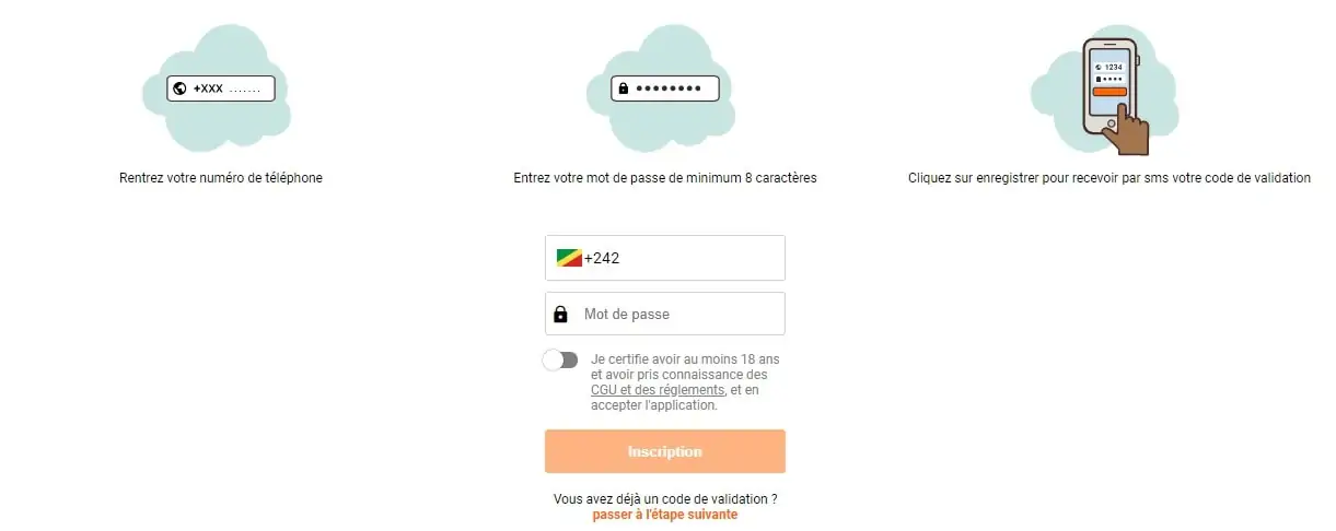- La création du compte où il faut taper le numéro de téléphone, le mot de passe de 8 caractères au minimum;
