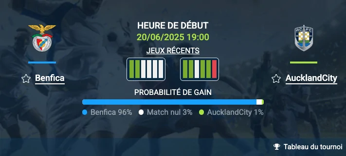 Est-ce qu’Auckland City parviendra à inscrire au moins un but en Coupe du monde des clubs ? Lors de ce tournoi, l’équipe n’est absolument pas compétitive et se retrouve dans une situation où tous les adversaires suivants sont intéressés par une victoire la plus large possible. Benfica est même chanceuse avec le calendrier. D’abord, elle affronte le principal outsider, puis, lors de la dernière journée, elle pourrait rencontrer un Bayern Munich potentiellement peu motivé. De notre côté, nous envisagerons différents scénarios afin de faire un pronostic optimal. À noter : la rencontre se déroulera à Orlando, au stade Inter&Co.