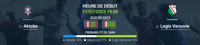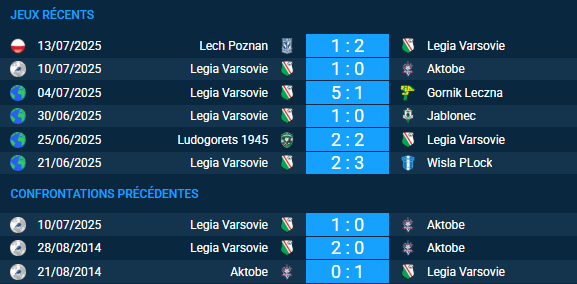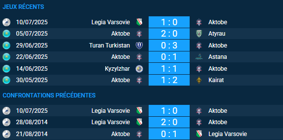 - Dernier match (10/07/2025) : Legia 1-0 Aktobe