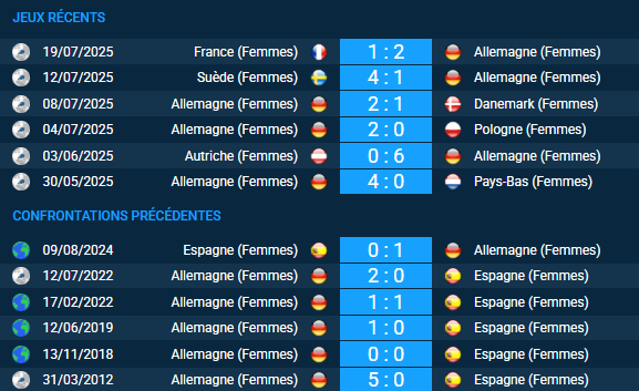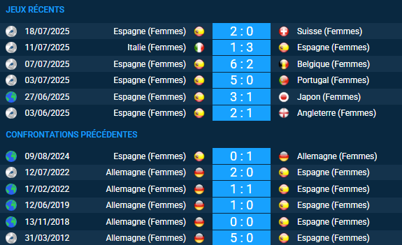 Le dernier affrontement officiel remonte au 9 août 2024 : l’Espagne s’était imposée 1-0 à domicile face à l’Allemagne (59% de possession, 7 tirs cadrés contre 4). Depuis 4 confrontations au total, l’Allemagne n’a jamais perdu : 3 victoires, 1 nul, avec un total de 5 buts marqués contre 1, soit une moyenne de 1,5 but par match.