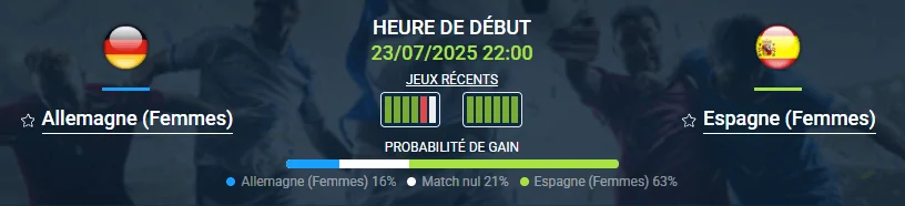 L’Espagne apparaît comme la favorite de ce pronostic Allemagne (Femmes) – Espagne (Femmes) : son football est plus fluide, et son collectif plus en forme. Cependant, l’Allemagne reste toujours redoutable dans les matchs à enjeu et n’a jamais perdu contre l’Espagne en compétition officielle. On peut attendre une rencontre fermée au début puis plus animée en seconde période, avec des occasions des deux côtés. Notre conseil : parier sur “plus de 2,5 buts”. Prédiction finale : Espagne 2-1 Allemagne, la Roja profitant d’une meilleure fraîcheur.
