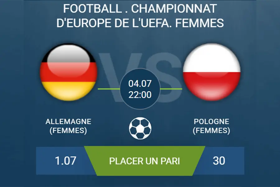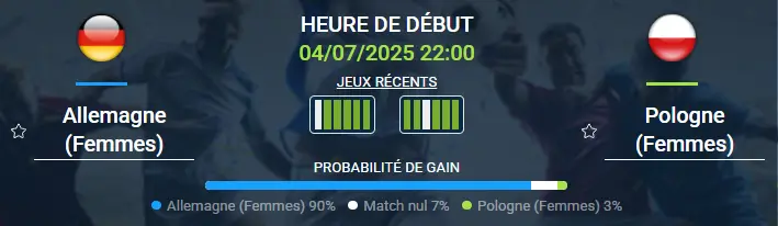 Le pronostic Allemagne (Femmes)-Pologne (Femmes) ouvre la campagne européenne pour deux équipes aux trajectoires opposées : l’Allemagne, 8 fois championne d’Europe, contre une Pologne toute nouvelle venue en phase finale. L’écart de niveau et d’expérience se reflète dans les cotes, largement favorables à l’Allemagne (Femmes).