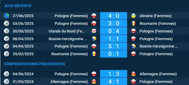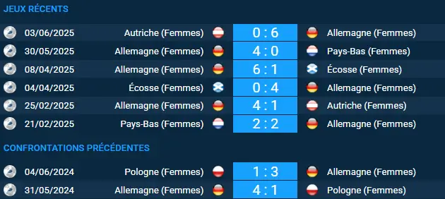 L’Allemagne (Femmes) et la Pologne (Femmes) se sont rencontrées deux fois officiellement. Leur dernier duel, le 4 juin 2024, a vu l’Allemagne s’imposer 3-1 à l’extérieur.