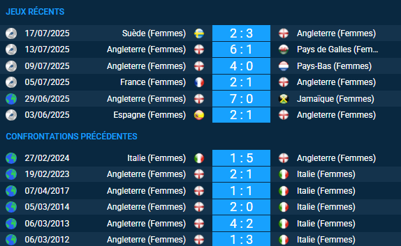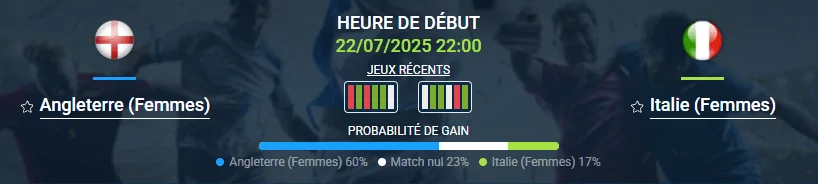 Ce pronostic Angleterre (Femmes) – Italie (Femmes) penche vers un match très disputé. L’Angleterre reste favorite sur le papier grâce à son expérience, mais l’Italie, bien organisée, pourrait offrir une vraie résistance. Compte tenu du passé offensif des confrontations et de la dynamique actuelle, nous conseillons un pari sur « plus de 2,5 buts ». Prédiction finale : victoire de l’Angleterre 2-1, mais l’Italie ne cédera rien jusqu’au coup de sifflet final.
