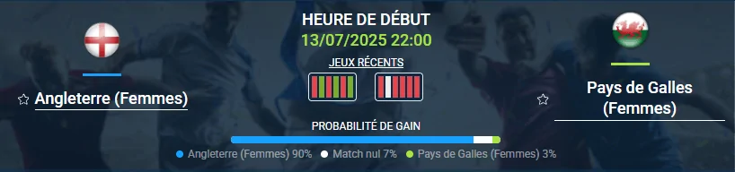 Le pronostic Angleterre (Femmes)-Pays de Galles (Femmes) attire l’attention des supporters avant la dernière journée du groupe D. Malgré deux défaites lors des deux premiers matchs, l’équipe féminine du Pays de Galles conserve encore une chance théorique de qualification, bien qu’elle soit actuellement dernière du groupe. Pour accéder aux quarts, il faudrait un miracle : battre l’Angleterre, tenante du titre, avec une différence de buts suffisante et espérer une défaite des Pays-Bas face à la France. Pourtant, les bookmakers et notre rédaction sont formels : l’Angleterre ne devrait pas perdre sa place. Certains parient sur une nouvelle victoire anglaise, tandis qu’une victoire du Pays de Galles, bien que cotée très haut, semble illusoire. Dès lors, quel pronostic Angleterre (Femmes)-Pays de Galles (Femmes) proposer quand toutes les statistiques pointent vers les favorites ?