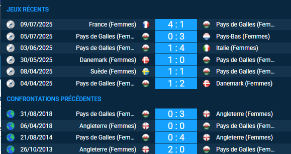 Pronostic Angleterre (Femmes)-Pays de Galles (Femmes) : confrontations directes
