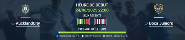 Le pronostic Auckland City-Boca Juniors est crucial : Boca Juniors peut-elle rejoindre les play-offs de la Coupe du Monde des Clubs ? Pour cela, il faudra compter sur une défaite de Benfica dans l’autre match du groupe. Mais un succès classique ne suffit pas : Boca doit viser un écart d’au moins six buts. En théorie, Auckland City, équipe semi-professionnelle, semble l’adversaire idéal pour y parvenir dans ce pronostic Auckland City-Boca Juniors. Pourtant, plusieurs scénarios sont envisageables et peuvent influencer le pronostic Auckland City-Boca Juniors. Notez que cette rencontre se déroule à Geodis Park, Nashville.