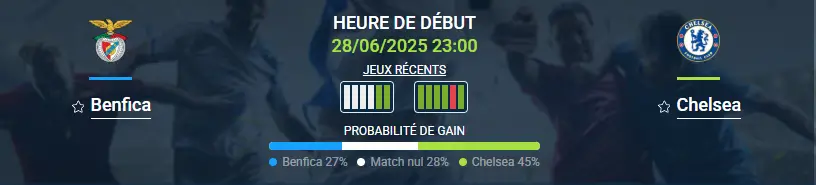 Le pronostic Benfica-Chelsea est au centre de toutes les attentions avant ce huitième de finale de la Coupe du monde des clubs. Benfica a-t-il les moyens de surprendre Chelsea ? À Charlotte, le duel oppose le vice-champion du Portugal au vainqueur de la Conference League. Les bookmakers donnent Chelsea favori, mais comme le montre l’analyse de ce pronostic Benfica-Chelsea, il ne faut pas sous-estimer le parcours solide des Lisboètes en phase de groupes. Le vainqueur retrouvera en quart de finale le meilleur du derby brésilien Palmeiras – Botafogo.