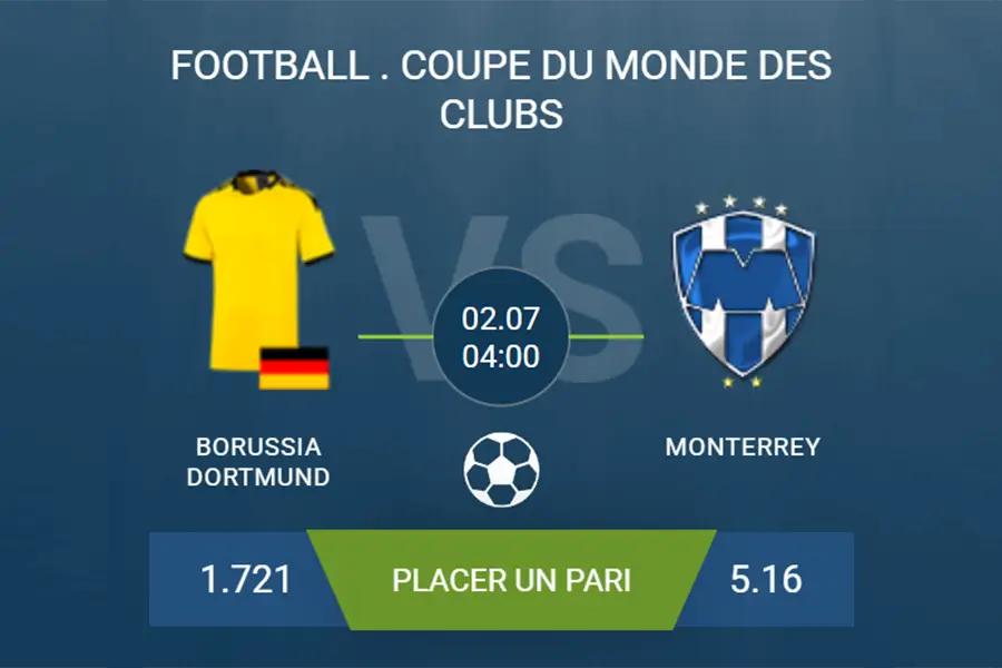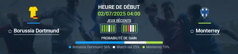 Notre pronostic Borussia Dortmund–Monterrey : victoire de Dortmund et les deux équipes marquent (2-1 possible). L’écart risque d’être minime, mais la dynamique du BVB laisse présager une qualification allemande.