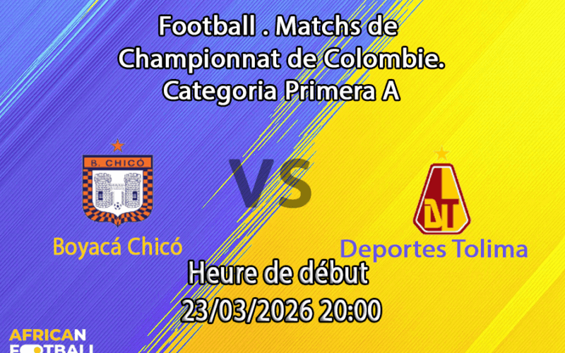 Lundi 23 mars 2026, 20h00 — Estadio La Independencia (21 000 places), Tunja, Boyaca. La 13e journee de la Categoria Primera A 2026 (Liga BetPlay Apertura) oppose Boyaca Chico (19e, 7 pts, 2V-1N-8D) a Deportes Tolima (7e, 19 pts, 5V-4N-2D). Tolima est le favori NET avec des cotes autour de 1,83-1,91 vs 4,50-4,70 pour Chico. predit une victoire 0-2 Tolima.
