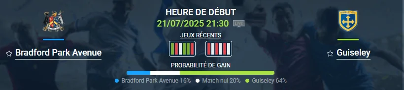Le pronostic Bradford Park Avenue – Guiseley attire l’attention des amateurs de football anglais : les joueurs vont-ils tout donner lors de cette rencontre amicale ? Le match Bradford Park Avenue – Guiseley se jouera le 21 juillet à 21h30 et pourrait surprendre par son intensité. Pour construire un précis, il est essentiel d’étudier les statistiques et les dynamiques récentes des deux équipes.