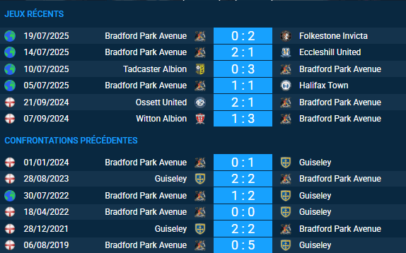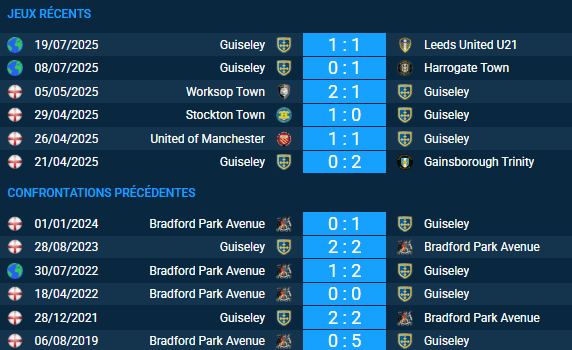 La dernière confrontation officielle entre Bradford Park Avenue et Guiseley remonte au 1er janvier 2024 : victoire 1-0 pour Guiseley. Statistiques clés du duel (Bradford Park Avenue à domicile) :