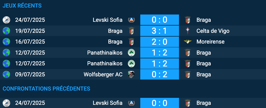 Braga peine à briller offensivement depuis la fin de saison dernière. Le nouvel attaquant espagnol Pau Víctor, arrivé de Barcelone, tarde à lancer sa machine, et la blessure du milieu Dorgeles ampute l’équipe d’une option de création. Les Portugais restent pourtant solides à domicile, n’encaissant presque jamais plus de deux buts sur leur pelouse (6 fois sur 7 avec moins de 3 buts).