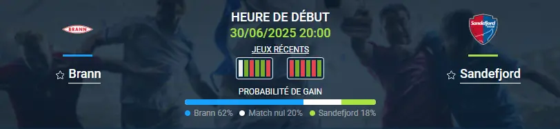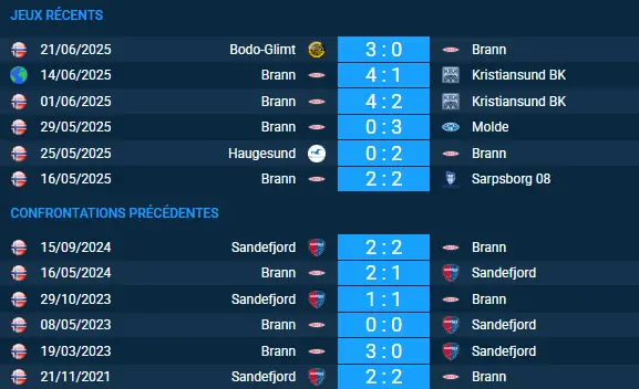 Le pronostic Brann-Sandefjord s’annonce alléchant : deux équipes au style offensif affiché promettent un affrontement animé et riche en buts. Brann impressionne depuis le début de saison avec 7 victoires en 12 matches, mais peine à sécuriser sa défense, alors que Sandefjord a prouvé sa capacité à trouver la faille à l’extérieur. Leur dernier face-à-face s’est terminé sur un score de parité spectaculaire, 2-2, reflétant la physionomie habituelle de cette affiche.