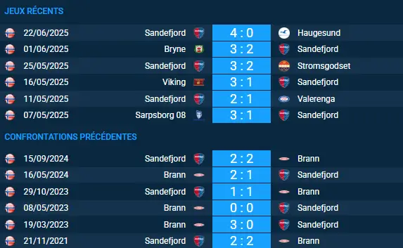 Sandefjord aborde ce match après une victoire convaincante 4-0 contre Haugesund (8 tirs cadrés, 48 % de possession). Leur efficacité offensive sur la route est indéniable : 6 succès lors des 10 derniers matches, moyenne de 2 buts marqués, et une défense correcte (1,5 encaissé par rencontre). Leur vitesse de transition demeure leur plus grand atout.
