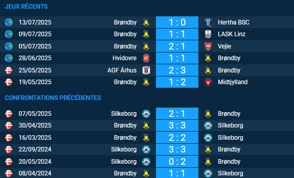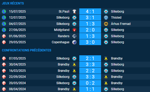 Le dernier duel officiel a eu lieu il y a deux mois et s’est soldé par la victoire de Silkeborg 2-1. Les statistiques étaient très équilibrées : possession de balle 50 %, corners 4 contre 5 et tirs cadrés 3 pour Brøndby contre 5 pour Silkeborg.