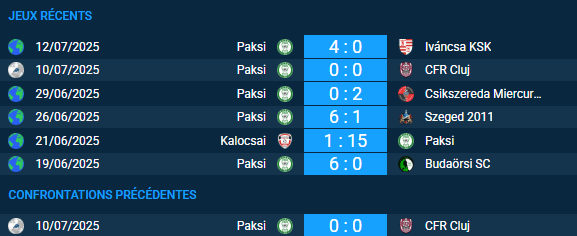 Paksi s’appuie sur une défense rigoureuse. L’équipe a perdu seulement deux fois sur les dix dernières sorties. La prudence reste son principal atout : six des sept derniers matchs se sont terminés avec moins de trois buts inscrits. En déplacement, les Hongrois préfèrent fermer le jeu et attendre des opportunités en contre.