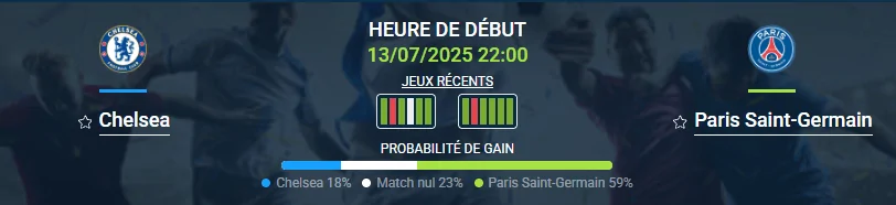- Selon Opta avant le tournoi, le PSG était favori (18,5 % de chances). Chelsea était sixième (8,4 %). Maintenant, les chances sont PSG – 64,19 %, Chelsea – 35,81 %.
