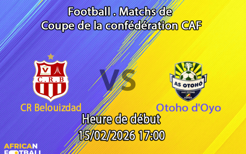 Samedi 15 février, 17h00 — Le Stade Nelson Mandela de Baraki accueille la finale du Groupe C de la Coupe de la CAF. CR Belouizdad reçoit AS Otoho d’Oyo dans un duel décisif pour la première place. Les deux équipes sont déjà qualifiées pour les quarts de finale après leurs victoires respectives lors de la 5ème journée. Le CRB est leader avec 12 points (4 victoires, 1 défaite) et un différentiel de +5 buts. Otoho suit en 2ème position avec 9 points (3 victoires, 2 défaites) également avec un différentiel de +5. Otoho avait humilié le CRB 4-1 au match aller à Oyo le 29 novembre. Match de prestige où les Algérois veulent prendre leur revanche.