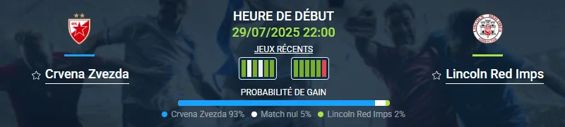 Le Pronostic Crvena Zvezda – Lincoln Red Imps retour du 2e tour de qualification de la Ligue des champions entre Crvena Zvezda et Lincoln Red Imps laisse planer une petite incertitude, mais la logique reste en faveur des Serbes. Malgré un seul but d’écart après la première manche, Lincoln se déplace à Belgrade avec une mission quasi-impossible. Les hommes de Vladan Milojević partent largement favoris pour rejoindre le troisième tour, tandis que Lincoln Red Imps rêve d’exploit, même si ses supporters savent que l’obstacle s’annonce immense.