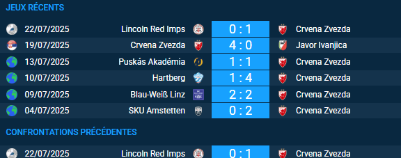 La Crvena Zvezda a commencé la saison sur un rythme impressionnant, remportant ses trois premiers matchs, dont une victoire 7-1 en Superliga. L’efficacité offensive saute aux yeux (15 tirs cadrés contre Belgrade), mais le buteur décisif à l’aller contre Lincoln, Bruno Duarte, est resté muet dans ce festival, tandis que l’équipe a fini le premier match européen à dix après l’expulsion de Sol Yong-Woo. Malgré cette infériorité numérique, les Serbes ont su préserver l’essentiel et restent invaincus.