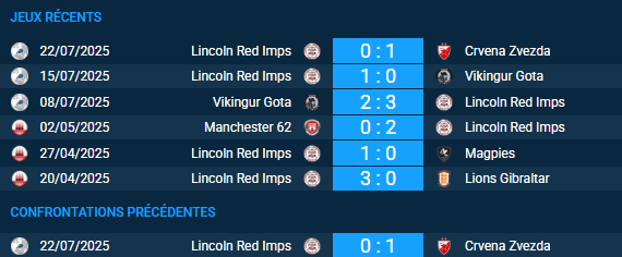 Lincoln Red Imps domine sur la scène locale, avec 9 victoires lors de ses 10 derniers matchs officiels. Mais la première opposition de haut niveau a mis un terme à cette belle série : même en supériorité numérique pendant une mi-temps, le champion de Gibraltar n’a pas pu égaliser contre Crvena Zvezda. L’expérience et la solidité des champions de Serbie ont fait la différence, et le défi s’annonce encore plus grand à Belgrade.