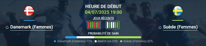 Le pronostic Danemark (Femmes)-Suède (Femmes) ouvre un choc nordique attendu lors du Championnat d’Europe féminin. Le match est prévu le 4 juillet à 19h00, et le statut de favorite revient logiquement à l’équipe de Suède (Femmes) selon les bookmakers (6.15 contre 1.55). Mais quelles joueuses pourraient surprendre et s’imposer comme héroïnes inattendues ?