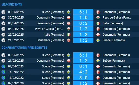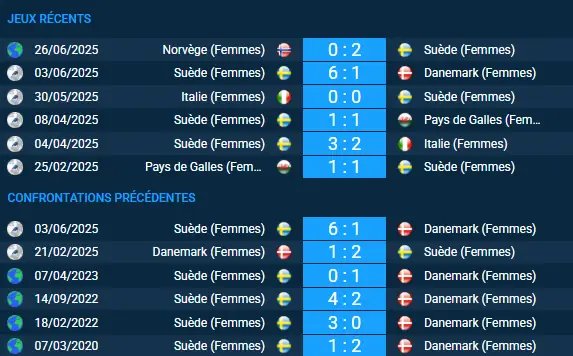 Lors du dernier match officiel entre ces deux sélections, le 3 juin 2025 en Ligue des Nations, la Suède (Femmes) l’a largement emporté 6-1 à domicile. Les chiffres marquants de cette rencontre :