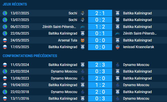 L’analyse du pronostic Dynamo Moscou-Baltika Kaliningrad met en avant la domination du Dynamo dans les confrontations directes. Lors des six derniers duels, le club moscovite a toujours gagné contre Baltika. L’an passé, le Dynamo a remporté le match à domicile 2-0, puis s’est imposé 3-2 à l’extérieur dans une rencontre serrée. Baltika encaisse souvent face au Dynamo : aucun clean sheet lors de ces six matchs et au moins deux buts concédés à cinq reprises.