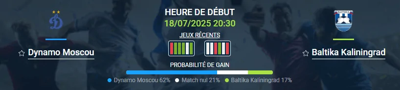 Dans ce pronostic Dynamo Moscou-Baltika Kaliningrad, il faut noter que le Dynamo a changé d’entraîneur après une saison 2023/24 instable. Valery Karpine arrive pour donner un nouveau souffle à l’effectif. Le club a recruté des éléments comme Maksim Osipenko et Ivan Sergeev. Pendant la préparation, les Moscovites se sont montrés solides avec des victoires convaincantes, notamment un 5-1 contre le Lokomotiv. Yaroslav Gladyshev, jeune attaquant, est à suivre après avoir marqué 10 buts la saison dernière.