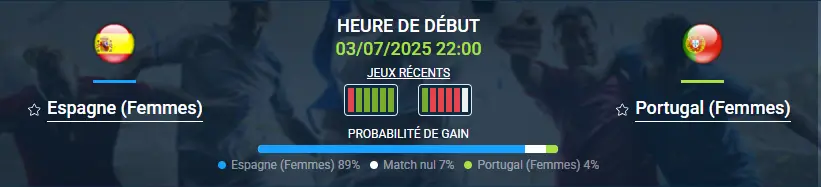 Le pronostic Espagne (Femmes)-Portugal (Femmes) ouvre le groupe B, où ces deux sélections affronteront aussi la Belgique et l’Italie. Sur le papier, l’Espagne (Femmes) est la grande favorite pour sortir du groupe, grâce à la qualité de son effectif, son niveau de jeu et sa forme actuelle. Le Portugal (Femmes), de son côté, n’aborde pas le tournoi avec autant d’assurance. Cependant, il ne faut jamais sous-estimer les Portugaises : elles pourraient bien se battre pour la deuxième place et surprendre dans ce pronostic Espagne (Femmes)-Portugal (Femmes). Reste à savoir quel style de jeu l’emportera : la domination espagnole avec une possession haute, ou le jeu de contre-attaque et de discipline défensive attendu côté portugais ? Nous allons tenter d’y voir plus clair pour notre pronostic Espagne (Femmes)-Portugal (Femmes).