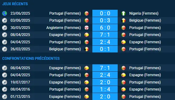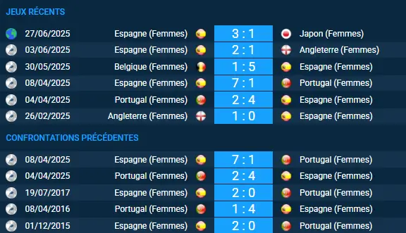 Le dernier match officiel entre l’Espagne (Femmes) et le Portugal (Femmes) remonte au 8 avril 2025 en Ligue des Nations UEFA. L’Espagne (Femmes) s’était imposée 7-1 à domicile :