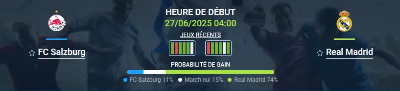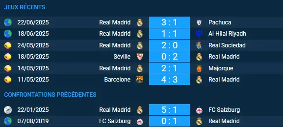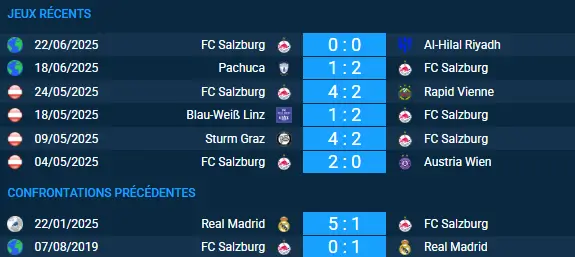 Les clubs du Mondial des clubs n’ont souvent pas d’historique, mais le pronostic FC Salzburg-Real Madrid fait exception. Leur duel officiel le plus récent remonte à janvier : au Bernabéu, les Merengues ont infligé un 5-1 à Salzburg en Ligue des champions. Rodrygo et Vinicius ont chacun marqué un doublé, tandis que Jude Bellingham a délivré deux passes décisives.