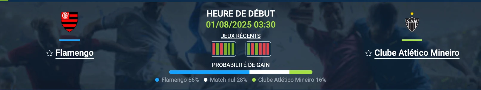 - Historique : sur 44 duels, Flamengo a gagné 21 fois, Mineiro 16, 7 nuls – et 2,68 buts de moyenne par match.