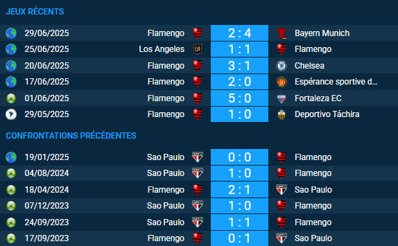 La dernière rencontre officielle entre Flamengo et Sao Paulo date du 4 août 2024, conclue sur le score de 1-0 pour Sao Paulo à domicile. Statistiques principales de cette confrontation :