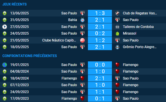 Avec trois revers consécutifs en championnat, Sao Paulo n’a pris que 2 victoires pour 6 nuls et 4 défaites, occupant la 14e place avec 12 points (10 buts pour, 14 contre). Ces chiffres montrent à quel point la tâche s’annonce ardue au Maracanã contre Flamengo. Toutefois, une victoire pourrait leur permettre de remonter jusqu’à la 12e position, tandis qu’une défaite risquerait de les plonger en zone rouge. Sur une note plus positive, Sao Paulo s’est brillamment qualifié pour les huitièmes de la Copa Libertadores, terminant premier du groupe D sans défaite.