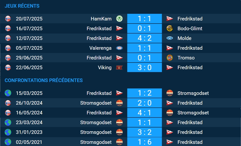 La dernière confrontation officielle remonte au 26 octobre 2024 et s’est soldée par un succès 2-0 pour Fredrikstad à domicile. Statistiques principales de cette rencontre :