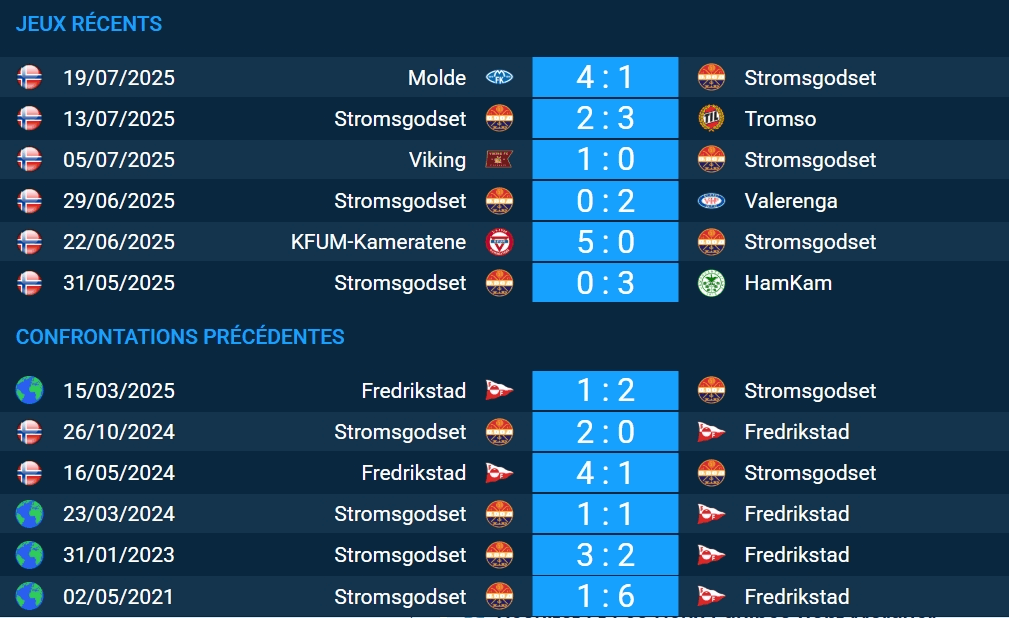 Au total, Fredrikstad et Stromsgodset se sont affrontés officiellement à deux reprises, le dernier duel s’étant également terminé par une victoire de Fredrikstad 2-0 le 26 octobre 2024.