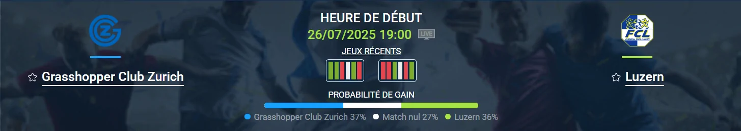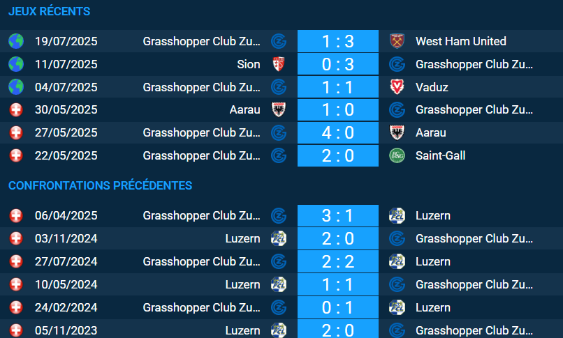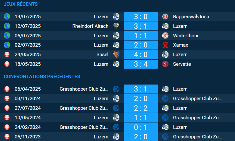 Même si la saison ne fait que débuter, ce match revêt déjà une grande importance. Grasshopper reste en quête de repères et apparaît vulnérable, surtout derrière. Lucerne, pour sa part, entre dans cette Super League avec une structure de jeu mieux rodée et une vraie cohérence collective. Même si la prudence pourrait dominer en début de saison, sur la forme actuelle et la qualité offensive des visiteurs, il y a de fortes chances de voir Lucerne se montrer efficace.
