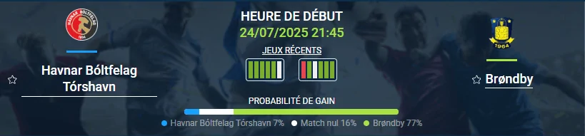 Ce choc promet du spectacle. Les Féringiens sont offensifs à domicile, même s’ils laissent des espaces derrière. Brøndby, de son côté, excelle en contre-attaque grâce à ses ailes rapides. Pour ce pronostic Havnar Bóltfelag Tórshavn – Brøndby, la meilleure option paraît être «les deux équipes marquent», tant les deux équipes aiment se projeter et oubliant parfois de défendre.