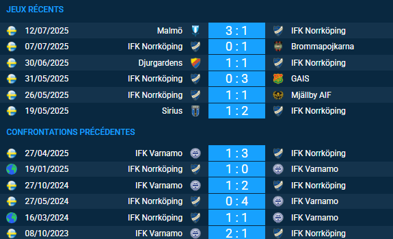 Le dernier match officiel s’est joué le 12 juillet 2025 en Allsvenskan (Malmoe – Norrköping). Score final : 3-1.