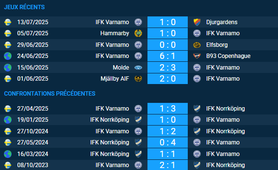 Le dernier match officiel entre ces équipes a eu lieu le 27 avril 2025 et s’est soldé par une victoire 3-1 de Varnamo. Statistiques de cette rencontre (Varnamo à domicile) :