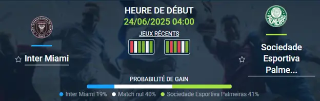 Avant d’affronter Palmeiras, Inter est deuxième de groupe avec 4 points. Pas droit à l’erreur, car une victoire d’Al-Ahly contre Porto ramènerait les deux équipes à égalité, et la qualification pourrait se jouer à la différence de buts – élément crucial de ce pronostic Inter Miami-Sociedade Esportiva Palmeiras.