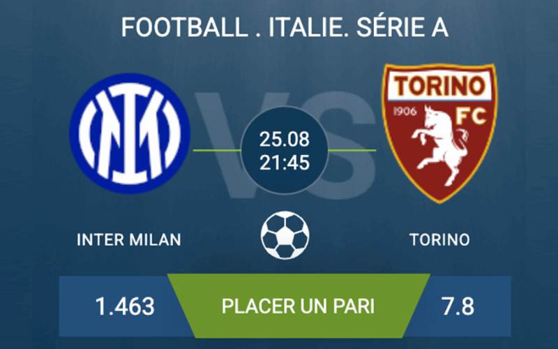 - Cotes Pronostic Inter Milan – Torino: succès Inter 1,45–1,60, nul 3,8–4,2, victoire Torino 6,0–7,0. Vérifiez les valeurs exactes le jour du match.