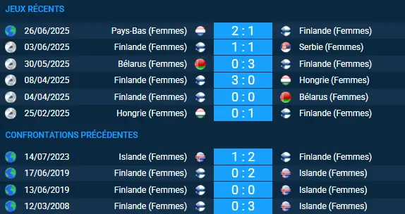 La Finlande reste sur un revers 2-1 face aux Pays-Bas (37 % de possession, 4 tirs cadrés). Les Finlandaises impressionnent par leur défense (0,6 but encaissé en moyenne) et leur progression constante. Avec 5 victoires et 3 nuls sur leurs 10 dernières sorties, elles semblent prêtes à imposer leur rythme même loin de leurs bases. Leur capacité à s’adapter et à jouer intelligemment sur terrain neutre fait clairement pencher ce pronostic Islande Finlande femmes en leur faveur.