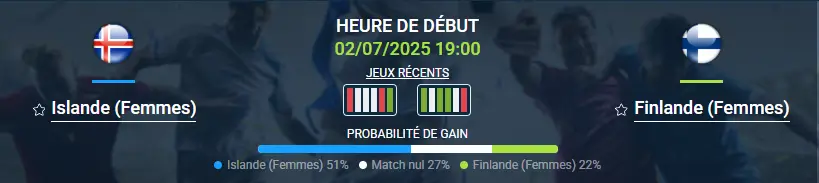 Le pronostic Islande Finlande femmes s’annonce palpitant : ce match du Championnat d’Europe promet un vrai duel entre deux sélections ambitieuses. Les deux équipes affichent une bonne forme, mais la Finlande paraît un peu plus solide en ce moment. D’ailleurs, la dernière confrontation directe a tourné à l’avantage des Finlandaises, ce qui motive l’Islande à prendre sa revanche dans ce pronostic Islande Finlande femmes. Tandis que la défense finlandaise impressionne par sa stabilité, l’attaque islandaise cherche à retrouver son efficacité loin de ses bases.